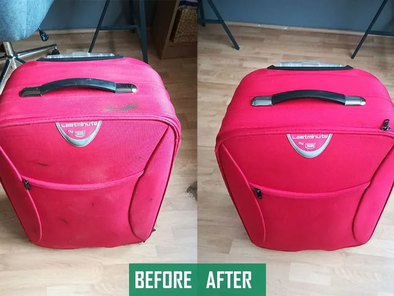 - Treat the whole suitcase with a foaming upholstery cleaner/shampoo, which will essentially loosen up all of the little particles stuck in the fabric, which will result in a better finish after steaming. Spray it all over the suitcase, rub it in with a brush, and wait five to ten minutes.